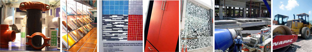 Pisos Cerámicos y Laminados, Madera, Recubrimientos, Grifería, Cocinas, Artículos para baños, puertas, cerraduras, herrajes, vidrio, cancelería y perfiles, electrodomésticos, tejas, cubiertas, y fachadas, mármoles, granitos y pinturas.
